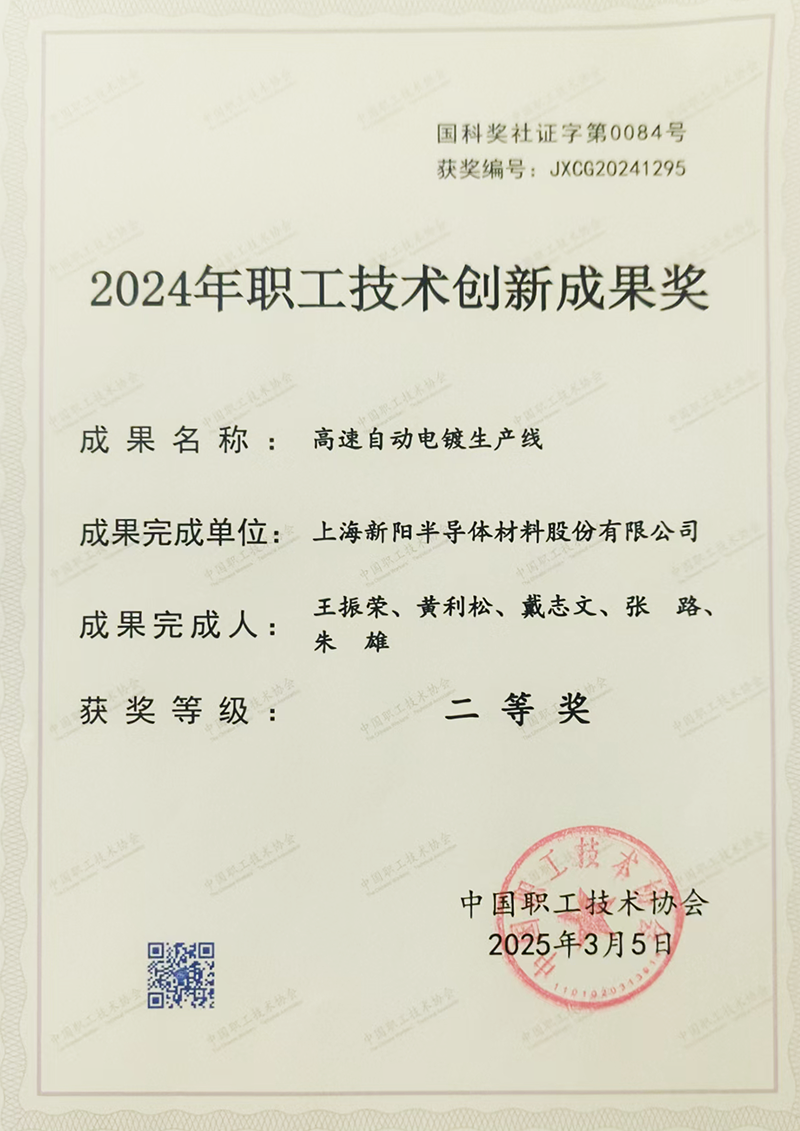 2025年3月5日,上海新阳半导体材料股份有限公司自主研发的“高速自动电镀生产线”项目,在2024年度全国职工技术创新成果评选活动中荣获二等奖。